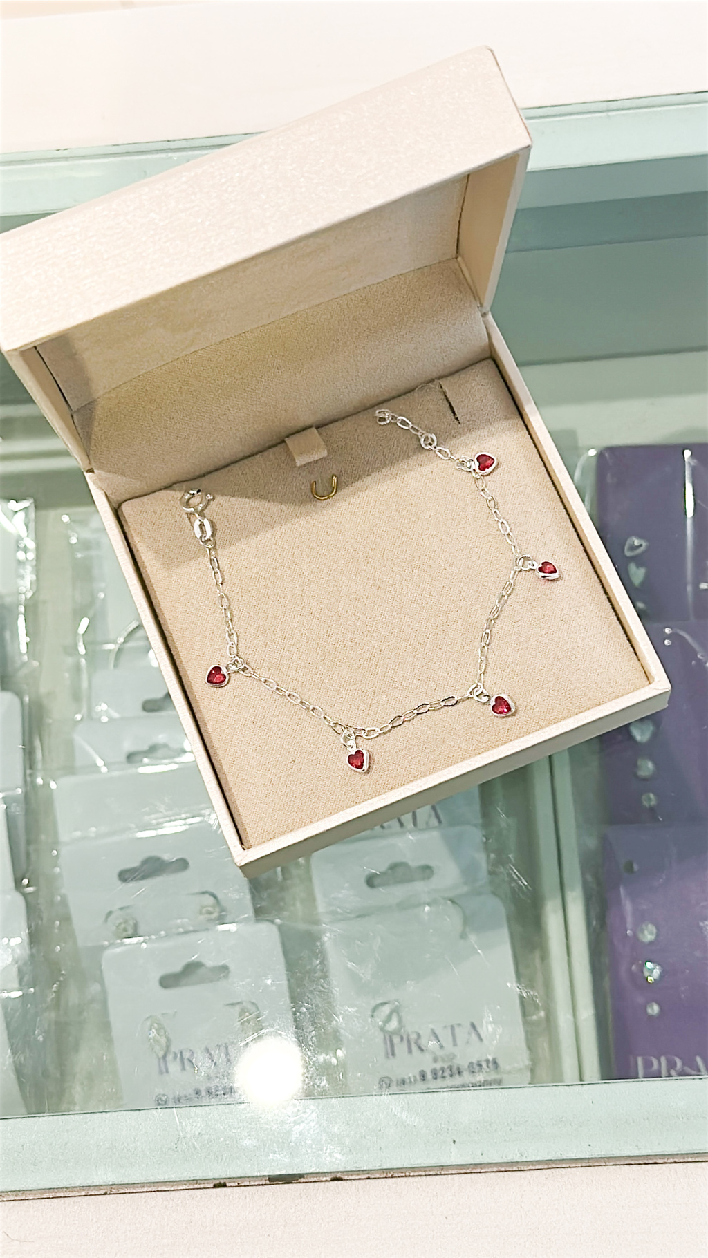 Pulseira 5 Corações em Prata 925: Um Símbolo de Amor e Elegância ❤️ Encante-se com a Pulseira cinco corações em prata 925 adornada com zirconias vermelhas, uma verdadeira declaração de amor e estilo. Cada coração é um lembrete de momentos especiais, perfeito para presentear ou para se mimar.